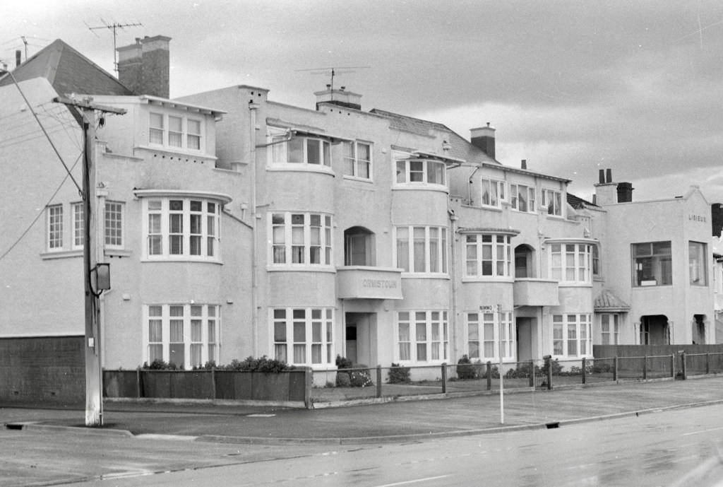 This has an HO but no research, but I found an ad from Oct 1915 describing them as new, which in fact makes them rather early for flats in Melbourne. Quite different in style from other pre WWI flats, typically in plain or Edwardian red brick. From Google maps they look like three independent buildings, in sets arranged a bit like terrace houses, but I think all built together, but possibly each with different names. The whole lot are known as Boniedoun, but the middle four were once called Ormistoun, as in the pic from 1974, on a balcony now gone.