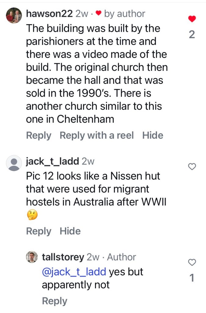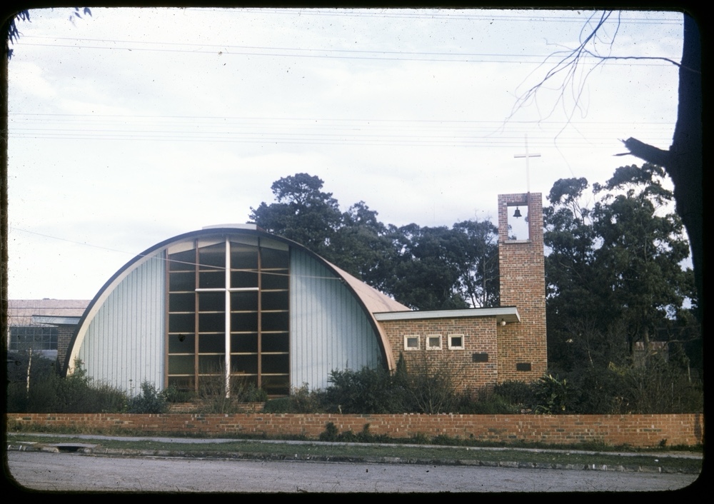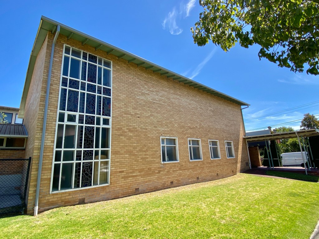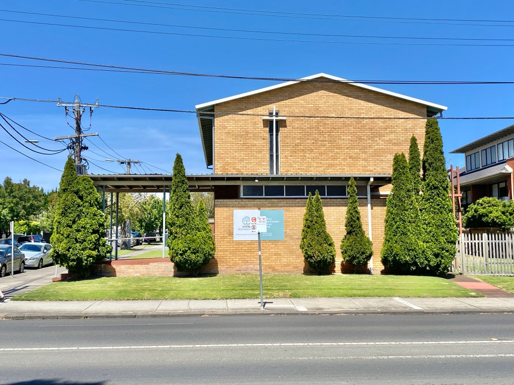 St Margaret’s Presbyterian was completed in May 1954, and up till about then churches were still being built with clearly Gothic form and details. The modernist arch roofed St Johns Mitcham was built the year before, but it’s long gone, and St Marks Lutheran in East Melbourne also 1953 has been very altered (last 2 pics), so this is the earliest. This one is very simple, a low pitched gable roof, with attached cross and steel propped porch, it almost doesn’t look like a church. Inside there’s two rows of steel posts creating the idea of side aisles, and there a stained glass window, so it feels a bit more churchy.