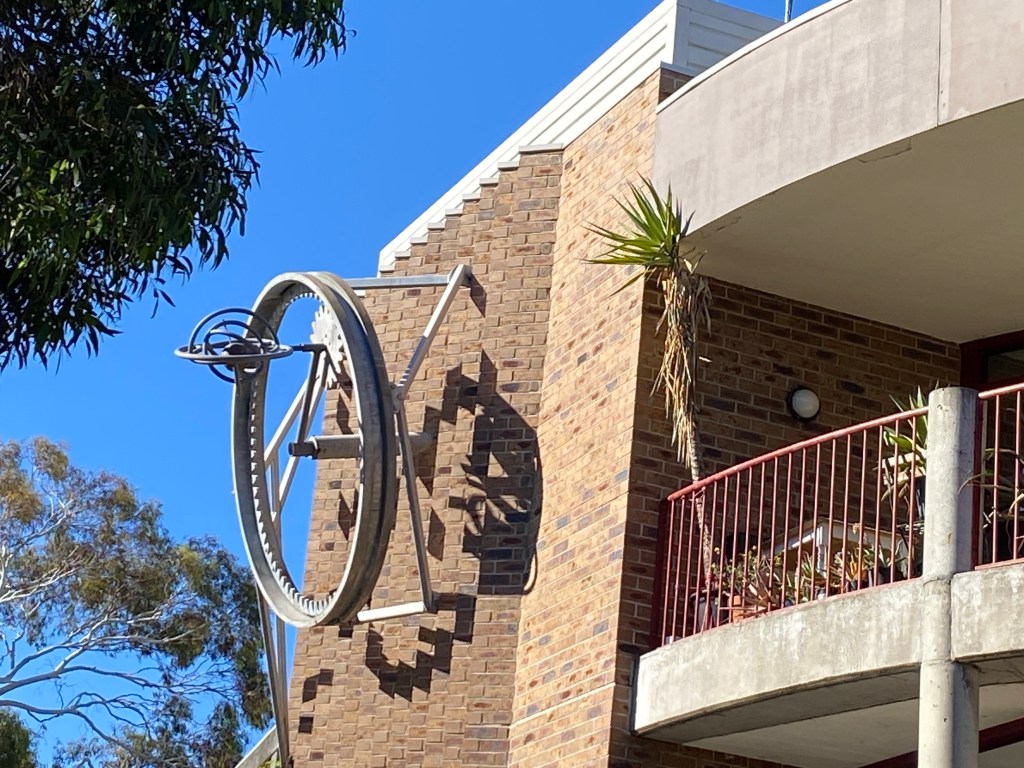 Tucked behind the Woolies next to the St Kilda Station tram stop is this intriguing bit of public art. It dates from 1996, by Cliff Burtt, whose ‘cosmological work references history and legacy’, hence the astrolabe/sextant look.