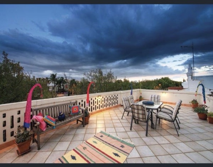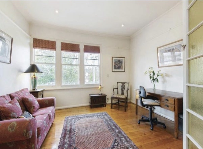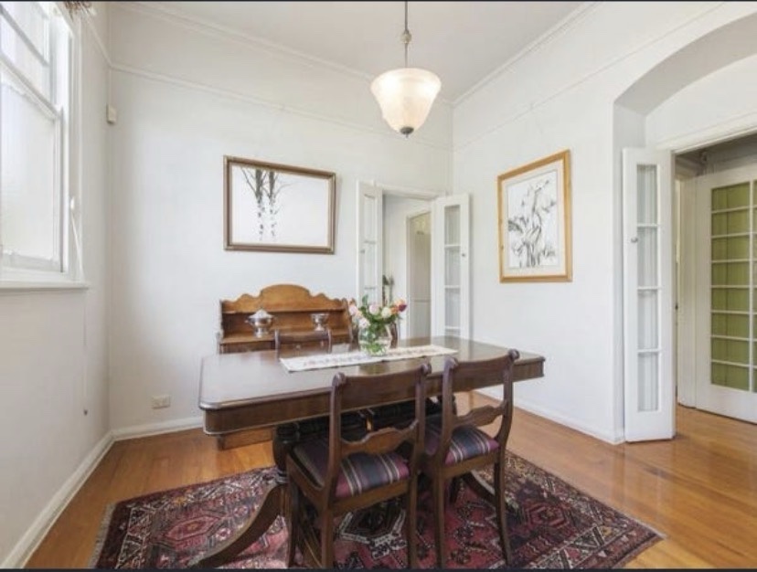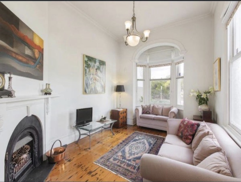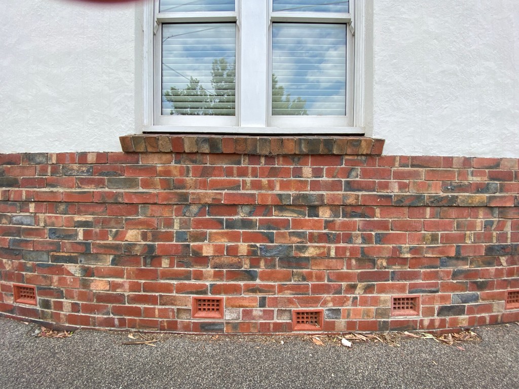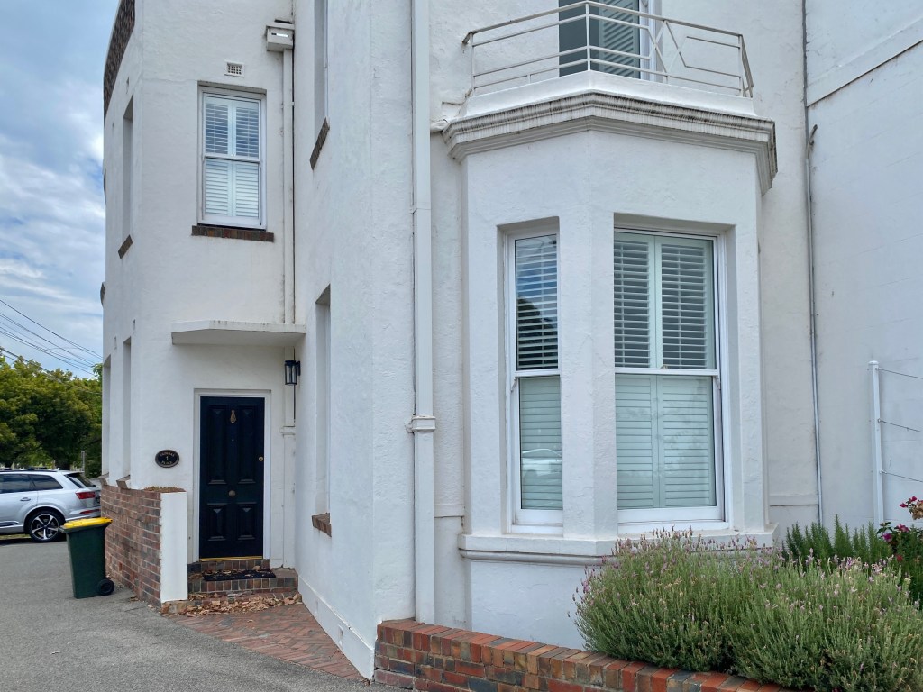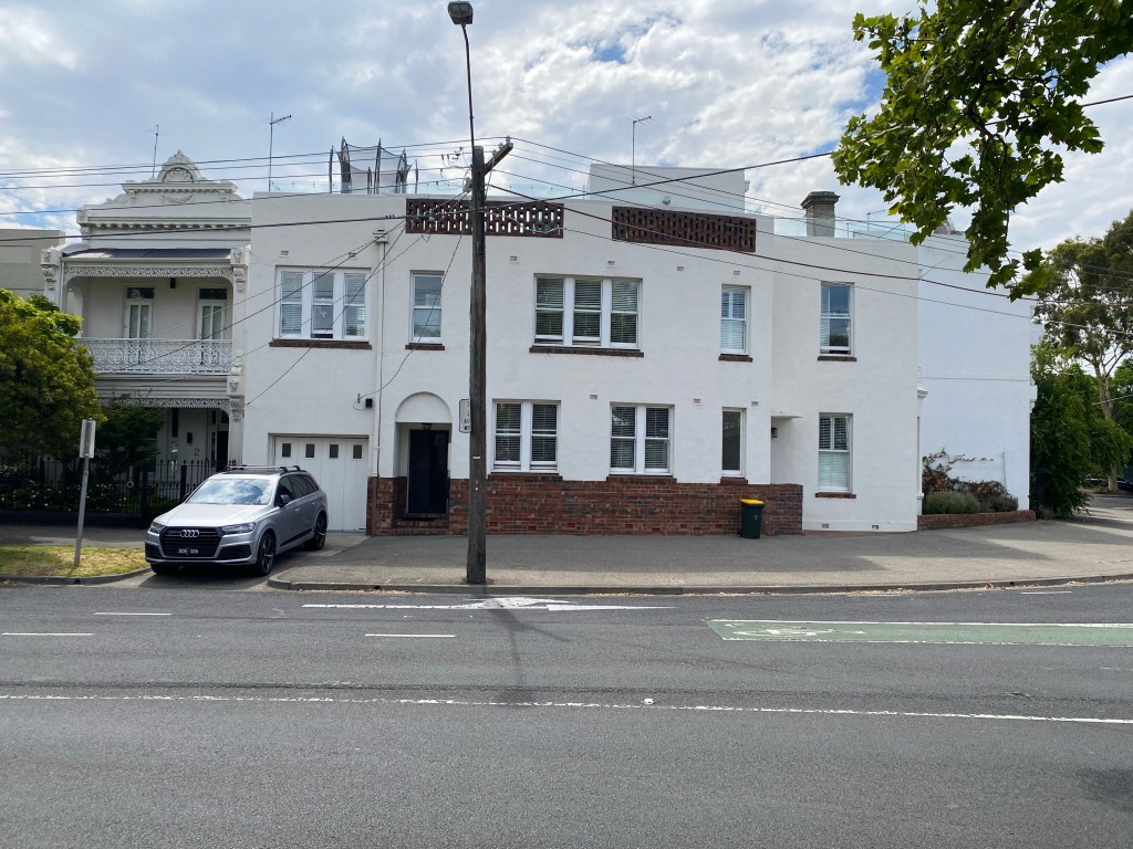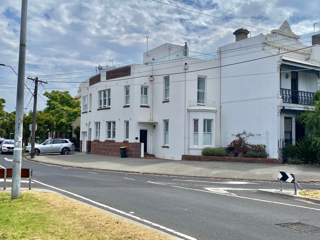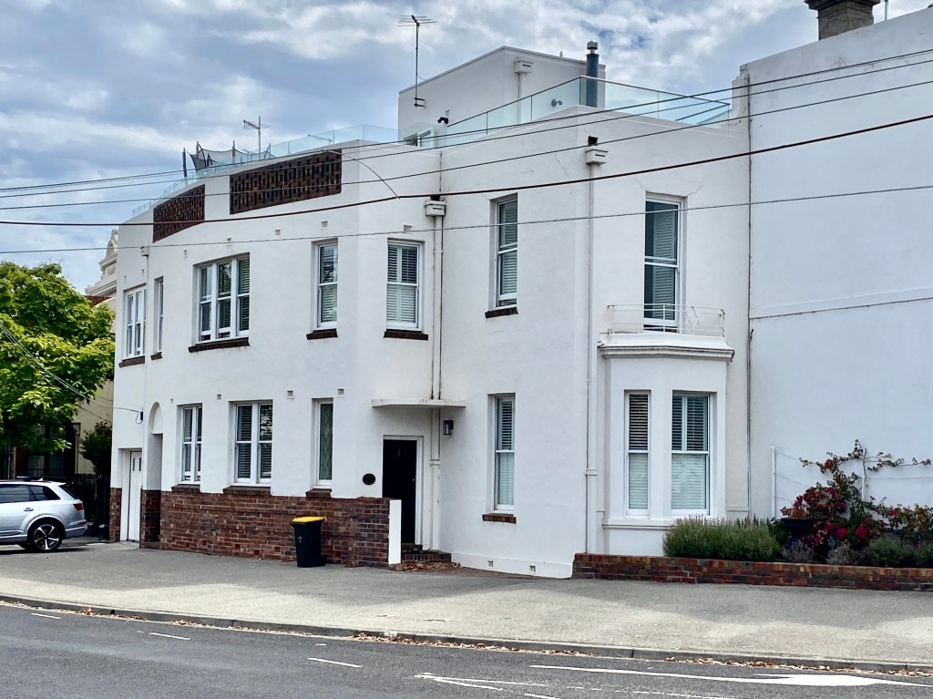 Curious place you’ve probably seen at the beginning of Kerferd Road, Albert Park, which sort of hugs the curved boundary. Since there’s a bay window up front, I assume it was Victorian terrace originally, then converted / expanded probably in the 1930s. I always thought it was turned into flats, since there’s two doors, but it’s a single house now, maybe always was. Nice brickwork and original garage and good rooftop too. But the traffic …..