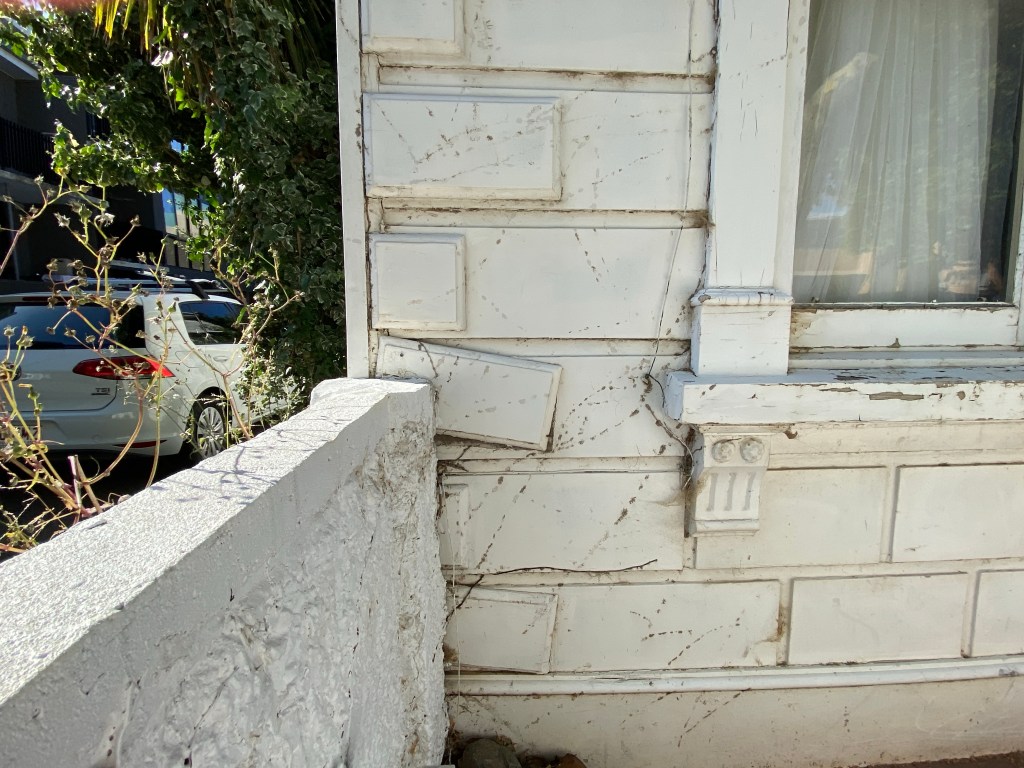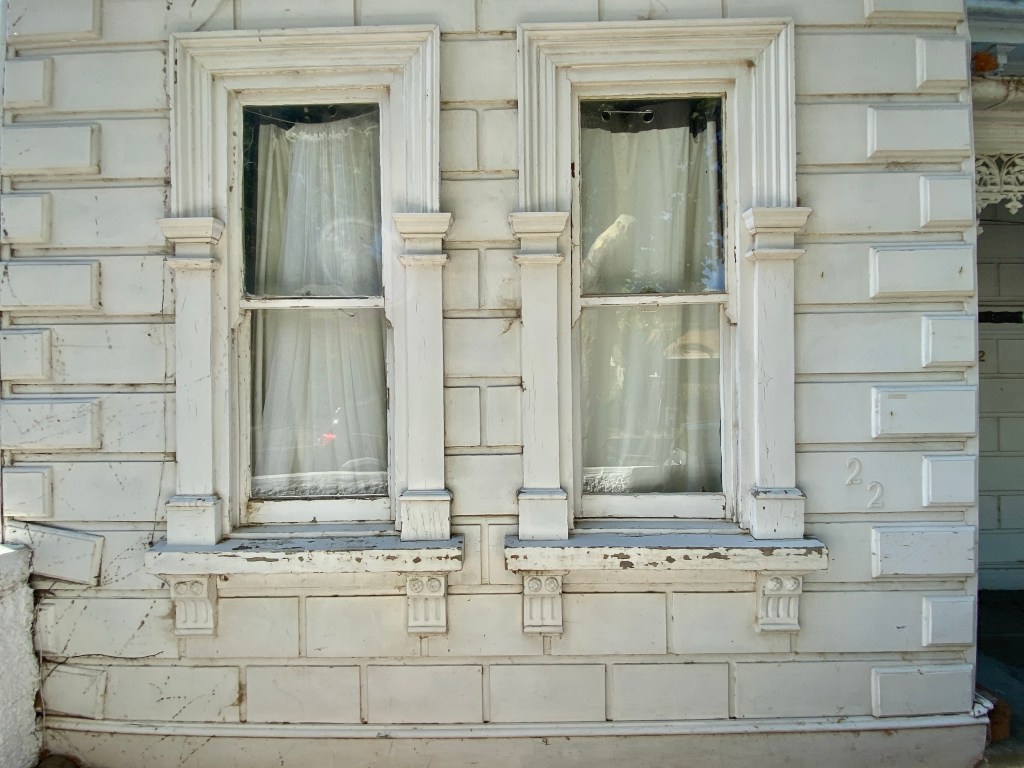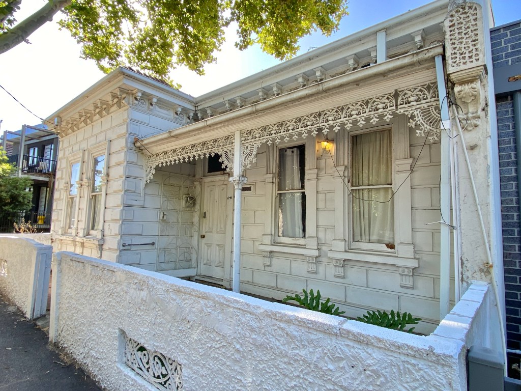 A rather decrepit looking Victorian cottage in Dickens Street Elwood, near Mitford, with a nicely elaborate use of block-fronting (imitating stone blocks) and lots of detailing around the windows.