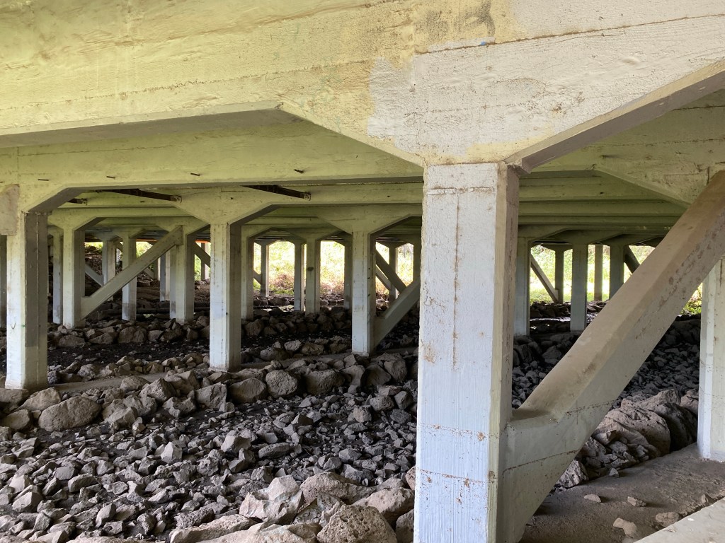 I knew the bridges were somewhat significant, so I took lots of pics. The Macauley Road one is 1923, and designed by the Monier Concrete Co, run by John Monash, interesting choice to have so many posts and beams. It’s got a rather thin and retro looking cast iron balustrade, made safer with concrete infills.