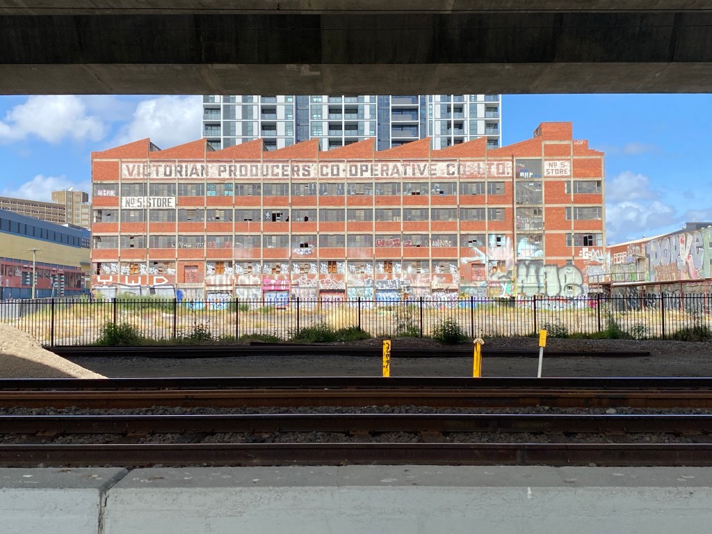 The Racecourse Road bridge dates from 1928, and it’s more typical of the period. And you get a nice view of the huge 1956 Victorian Producers Cooperative Woolstore (possibly designed by the engineer Cyril Hodspeth). And all of this happens under the hulking concrete of the 2000 Citylink freeway viaduct, which was clearly just an engineering solution with no design thought at all.