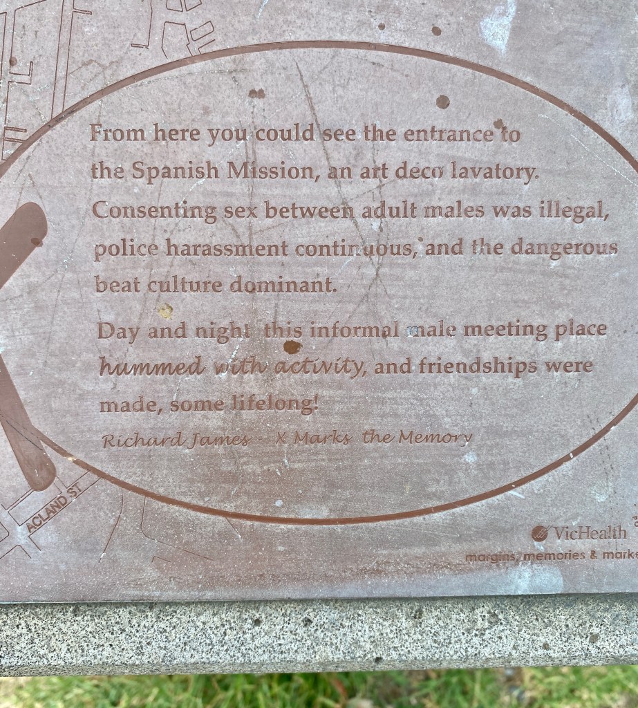 It was Pride March today in St Kilda, and on the edge of the Catani Gardens is one of those historic markers – and when I leaned in to read it I was very surprised to see it was all about a gay beat toilet block that once existed in the little gardens opposite! No photos of it I could find, but I did find earlier ones.
