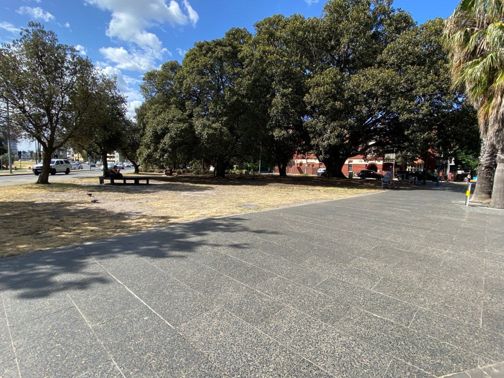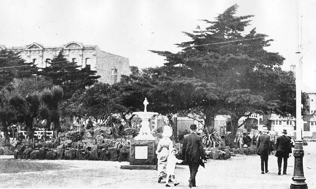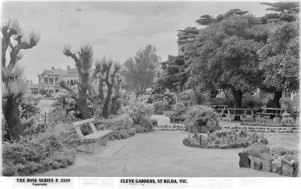 The little park is called Cleve Gardens after a long term St Kilda citizen Sali Cleve who donated a lot for Council beautification here – it looked quite different around 1911, with paths and seats and planting and trees, and a fountain. Now it’s mainly just one huge tree (a fig ?). I suppose the toilet block could have been 1930s. The park was shrunk in 1968 when the beach road was widened making it a less nice place to be.