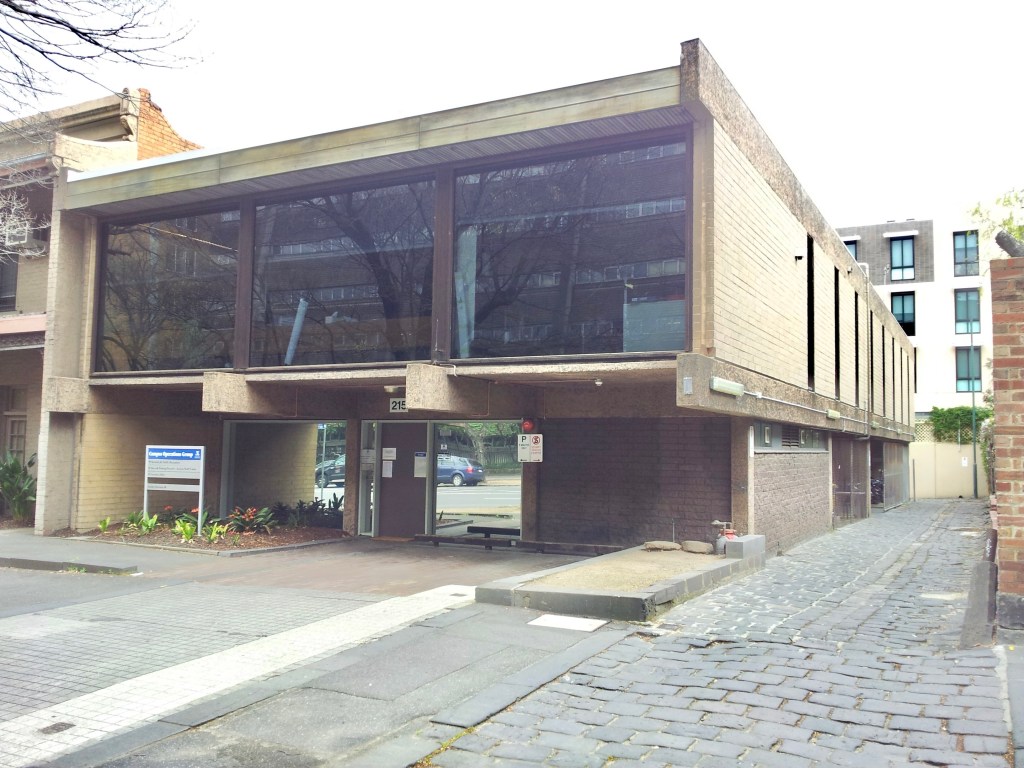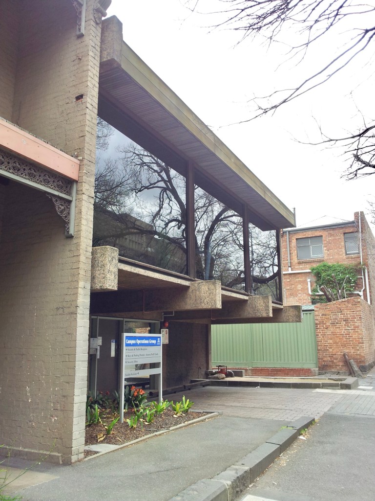 This little striking Brutalist thing in Grattan Street opposite the Uni was built as the offices of Eggleston MacDonald and Secomb, 1964. Which makes it pretty much the earliest example of concrete Brutalism in Victoria, a bit ahead of the famous Total carpark in Russell Street, completed 1965. I quite like the expressed rough textured conc beams, that seem over designed to support that huge expanse of dark glass.