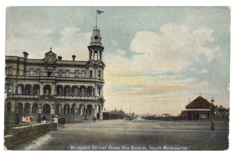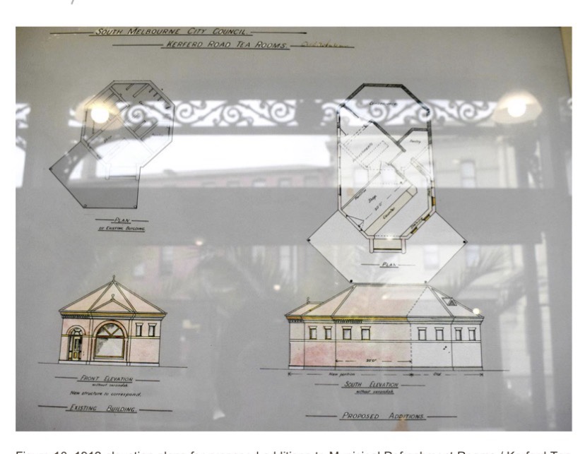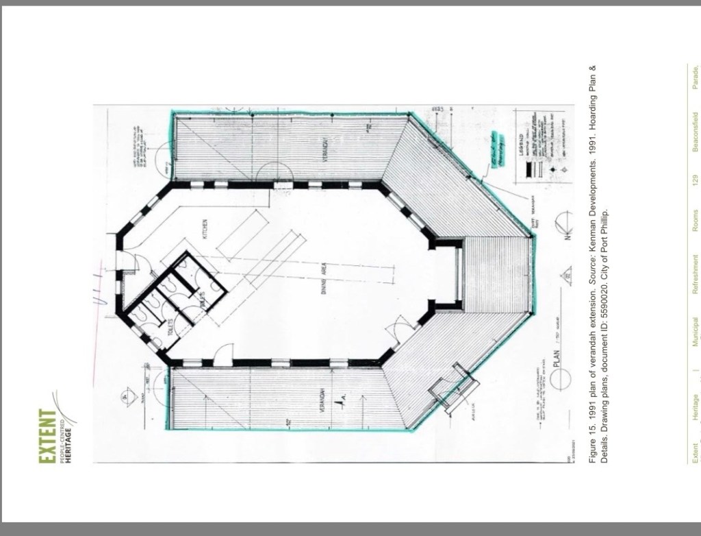 It started as a little octagonal pavilion with a small verandah just in front and to the west, built c1905 by South Melbourne Council as the Municipal Refreshment Rooms, with toilets out the back. The area got more popular, I guess promenading down the pier, and the rooms were soon made much bigger by extending towards the beach, with a verandah on three sides.