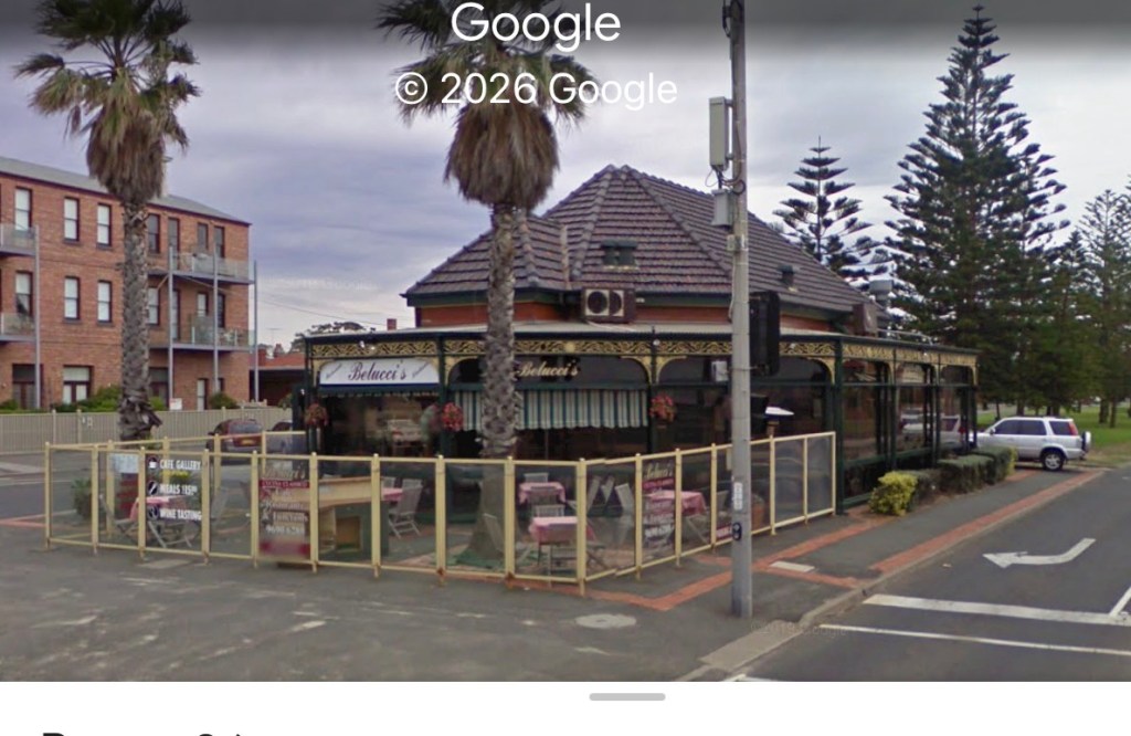By the 50s it was more of a sweet shop/milk bar, and probably round then lost the verandah – which was rebuilt, but longer, probably in 1974 when it became a restaurant, De Marcos. Then the verandah was enclosed with glass walls in 1991, and in the 2000s it was called Belucci’s, with outdoor seating too.