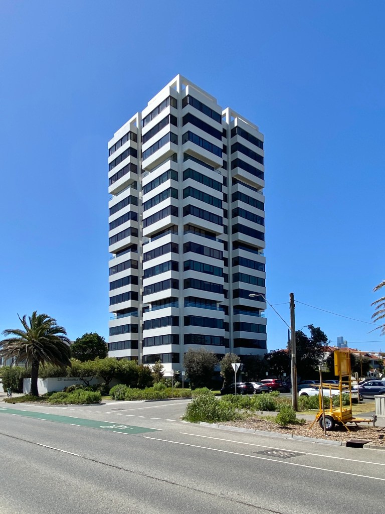 Hobson’s Bay Tower, on Beaconsfield Parade Middle Park, in Dec last year. Not my favourite high rise, but it does do some interesting things, with two projecting bays on all sides and three sets of insets to emphasise the way they project. I found a reference that it was built in 1980, and designed by Sol Sapir, who did virtually all the high rise along the foreshore between 1968 and about 1980.