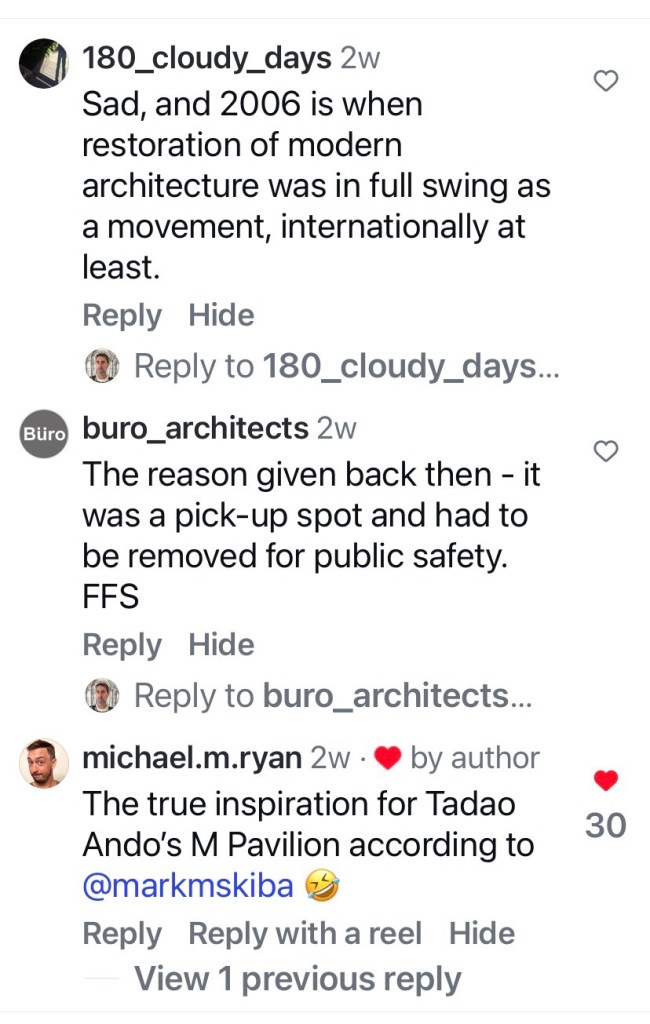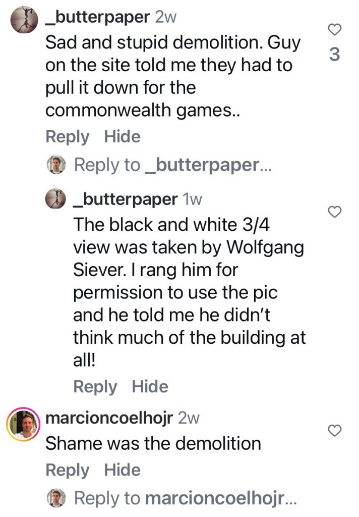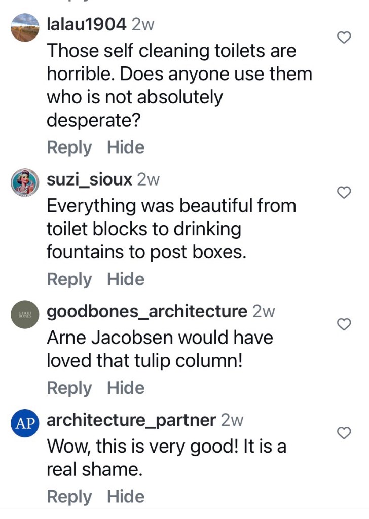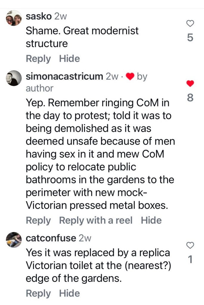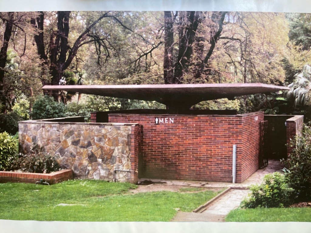 This was just labelled 1950s, but Peter Johns’ @_butterpaper blog from 2006 says it was built in 1957, and was designed by the @cityofmelbourne architects. That post also describes the day it was unexpectedly demolished in May 2006. The main reason was “…complaints about offensive and intimidating behaviour from individuals who chose to linger there.” ie it was a well known gay beat. Also that it was a modern intrusion into a heritage garden (never mind that since then they’ve since built a modern cafe at the south end, albeit where there used to be a depot). Also it was/is council policy to have facilities at the edges not the middle. And to have those self-cleaning unisex ones. But in this case, they could have lowered the walls or removed the brick ones, and left the roof as a nice picnic spot.