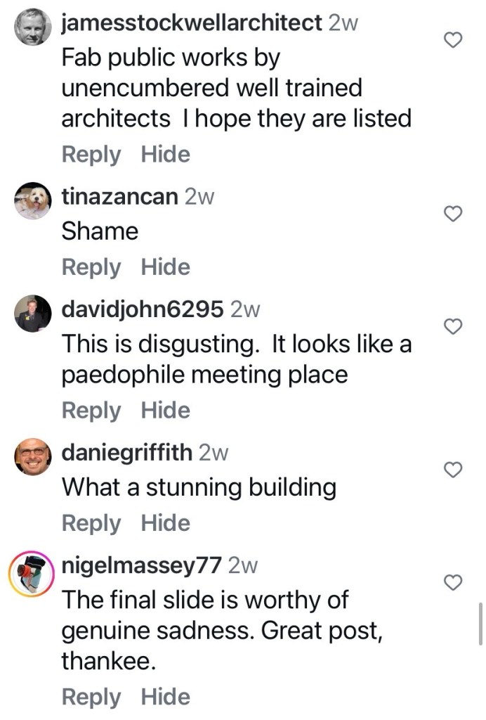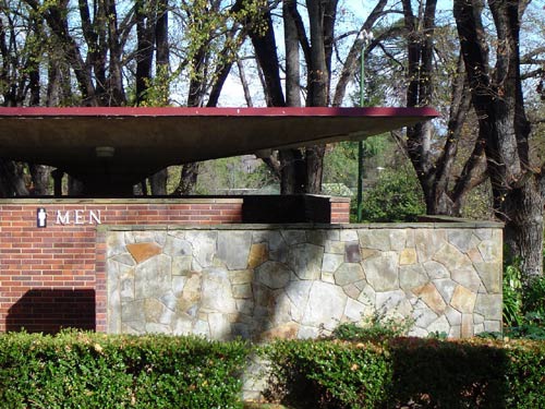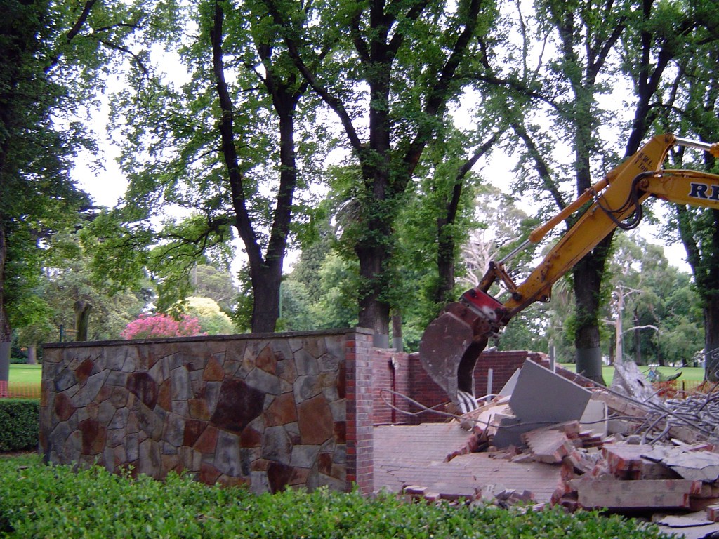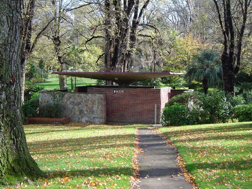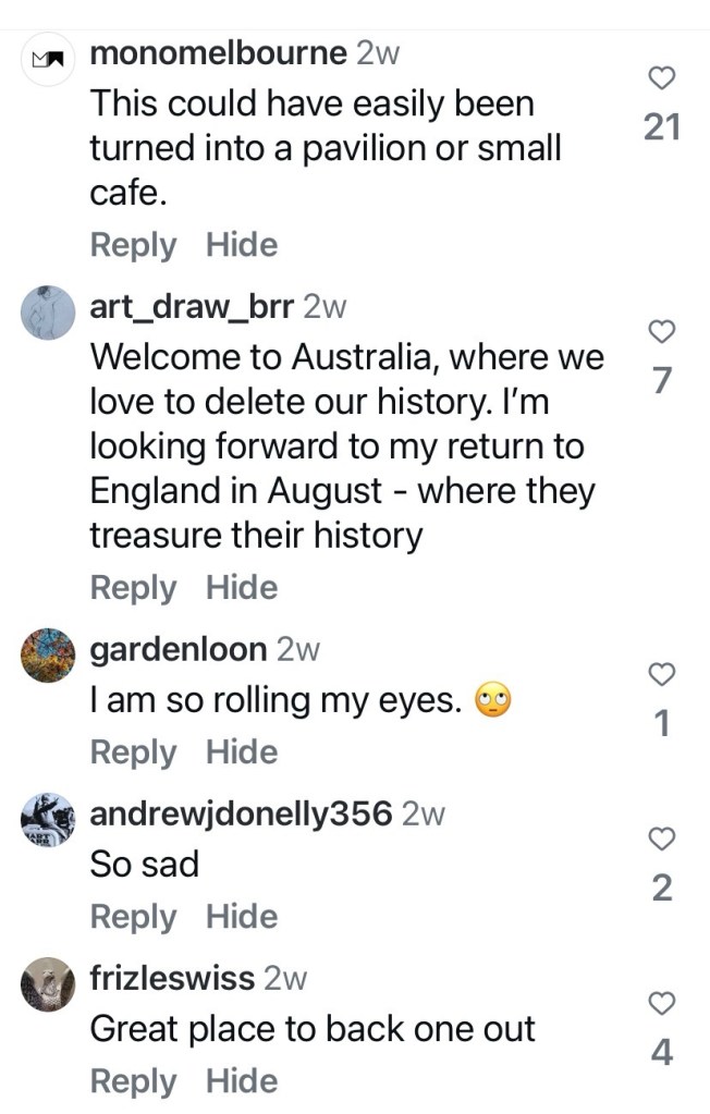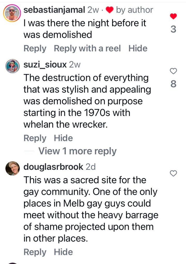 This was just labelled 1950s, but Peter Johns’ @_butterpaper blog from 2006 says it was built in 1957, and was designed by the @cityofmelbourne architects. That post also describes the day it was unexpectedly demolished in May 2006. The main reason was “…complaints about offensive and intimidating behaviour from individuals who chose to linger there.” ie it was a well known gay beat. Also that it was a modern intrusion into a heritage garden (never mind that since then they’ve since built a modern cafe at the south end, albeit where there used to be a depot). Also it was/is council policy to have facilities at the edges not the middle. And to have those self-cleaning unisex ones. But in this case, they could have lowered the walls or removed the brick ones, and left the roof as a nice picnic spot.