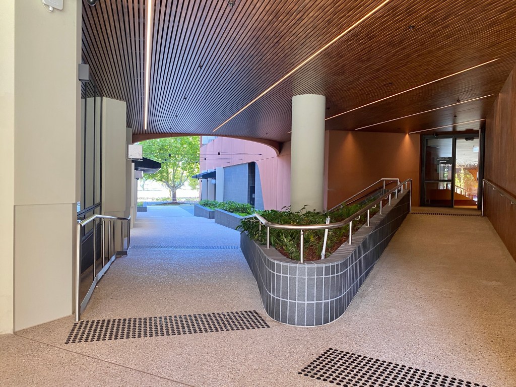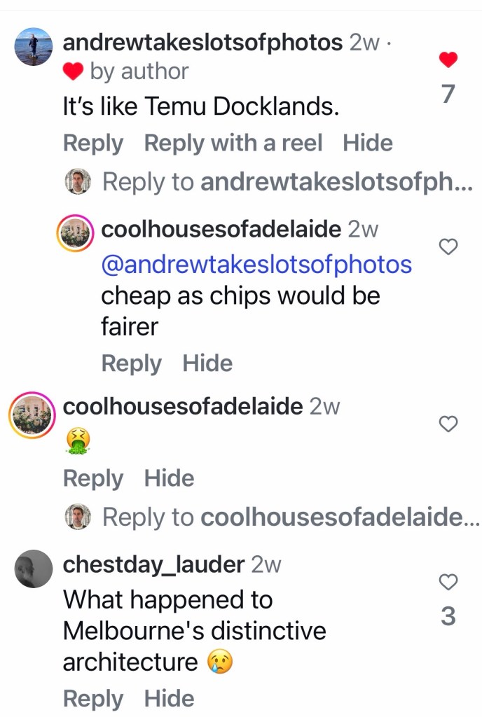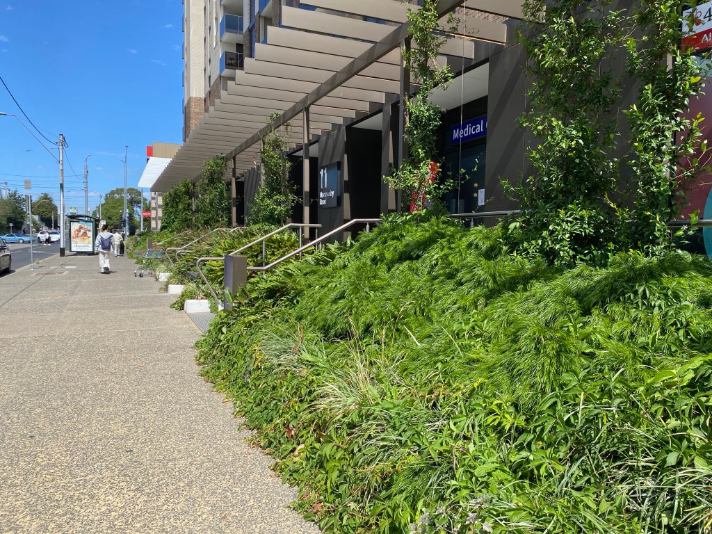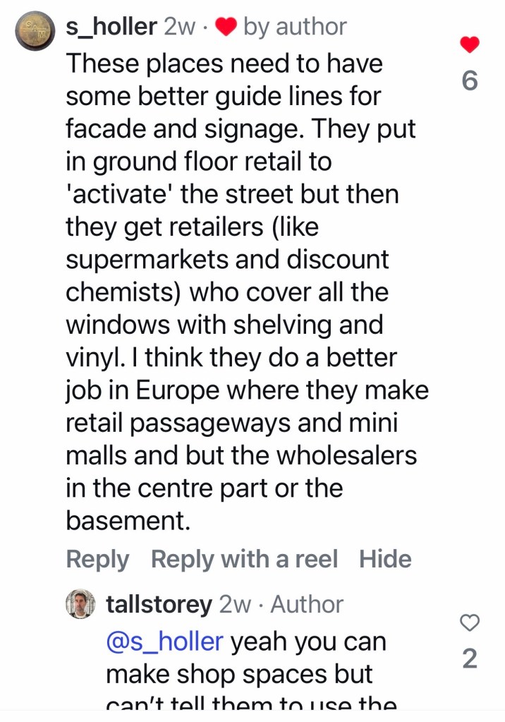 I was surprised to learn it’s by @armarchitecture, they really lost it here. The northern part was completed in 2022, built to rent. It’s got some shops along the street through the middle, which could have been like a shopping strip, but instead they’re partly hidden, at different levels too. There’s some great planting on the north side, good for a cafe, but no, it’s a path lab, and big gap for the carpark entry.