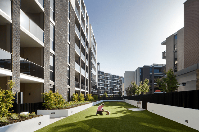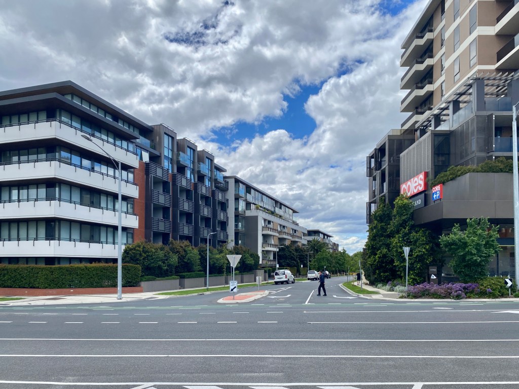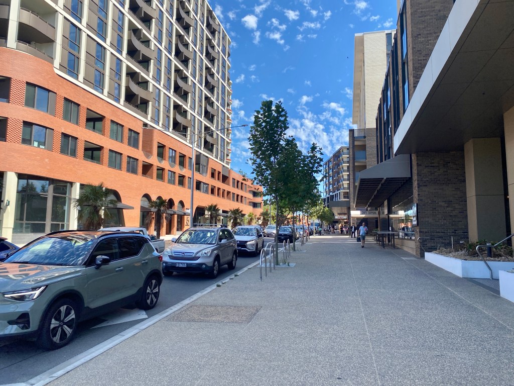 The plaza leads to a walk through, with the southern triangular section beyond. It’s build to sell, and a bit more interesting. It has a row of pretty traditional style shops facing the racecourse, mostly occupied. There’s grassy gaps within the blocks, which is nice, though mostly the flats look at each other, but that’s ok I guess.