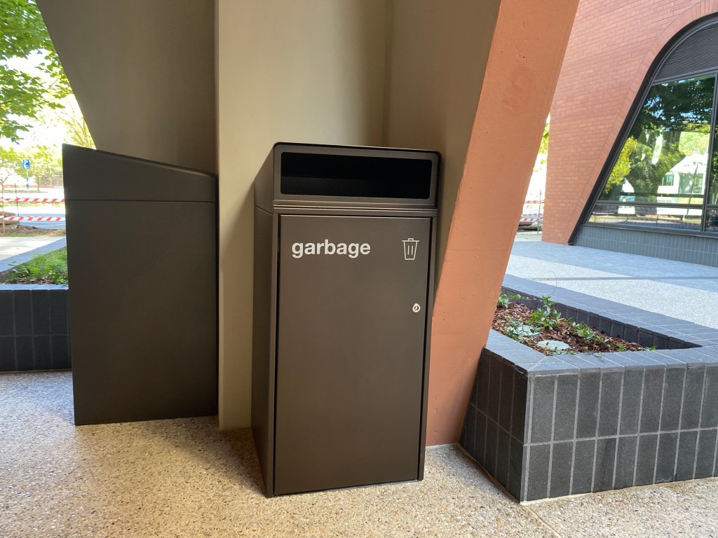 The whole thing looks exactly like the drawings. Not quite finished yet, no rental ads I could find. There’s one more triangular site to go, but no plans yet I could see. I wondered why they bothered keeping the short street dividing them, more efficient not to, but it does have some great big plane trees. Nice to see they provide bins, but not exactly matching. The new tower looks best from within the plaza across the street, with its rather sad palm tree.