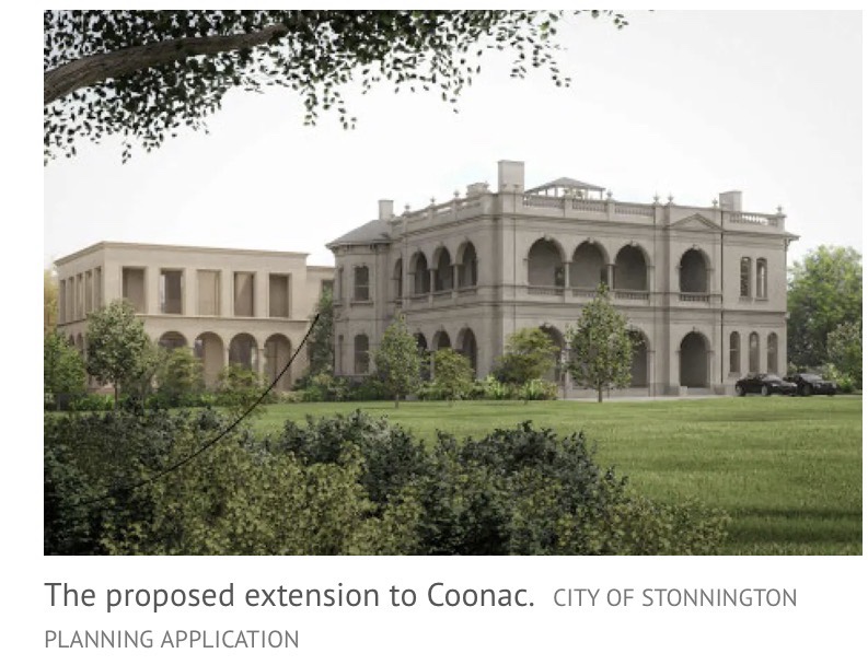 The grand Victorian mansion Coonac in Clendon Road Toorak is in the real estate news because the new owner has applied to build an extension – but it’s really a second house, with entry living dining and five bedrooms and 20 car basement garage (left of first pic). It’s clearly a simple version of the main house, which in this case is ok. The Pratts did something similar to Raheen over 20 years ago, building an attached new house, but in contrasting modern style, the old house mainly used for entertaining. Which I suppose is fine, saves the house from too many changes. In this case it replaces the tennis court and pool, so the garden stays intact- it’s described as ‘behind’ though clearly more like next to. The new owner is ‘pharmaceutical billionaire’ Dennis Bastas, and when you’ve got that kind of money you can spend over $100mill for one of the largest estates in Toorak then $38mill for the extension. I wouldn’t though.