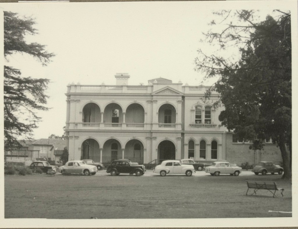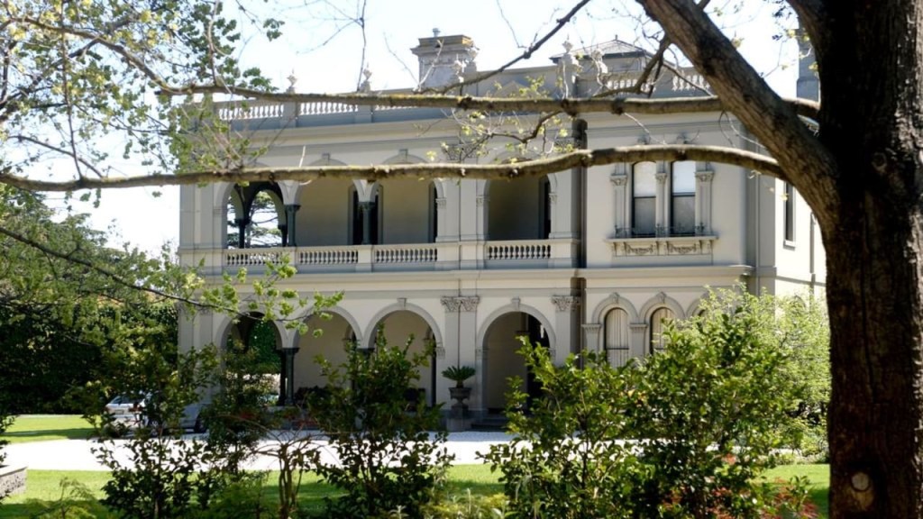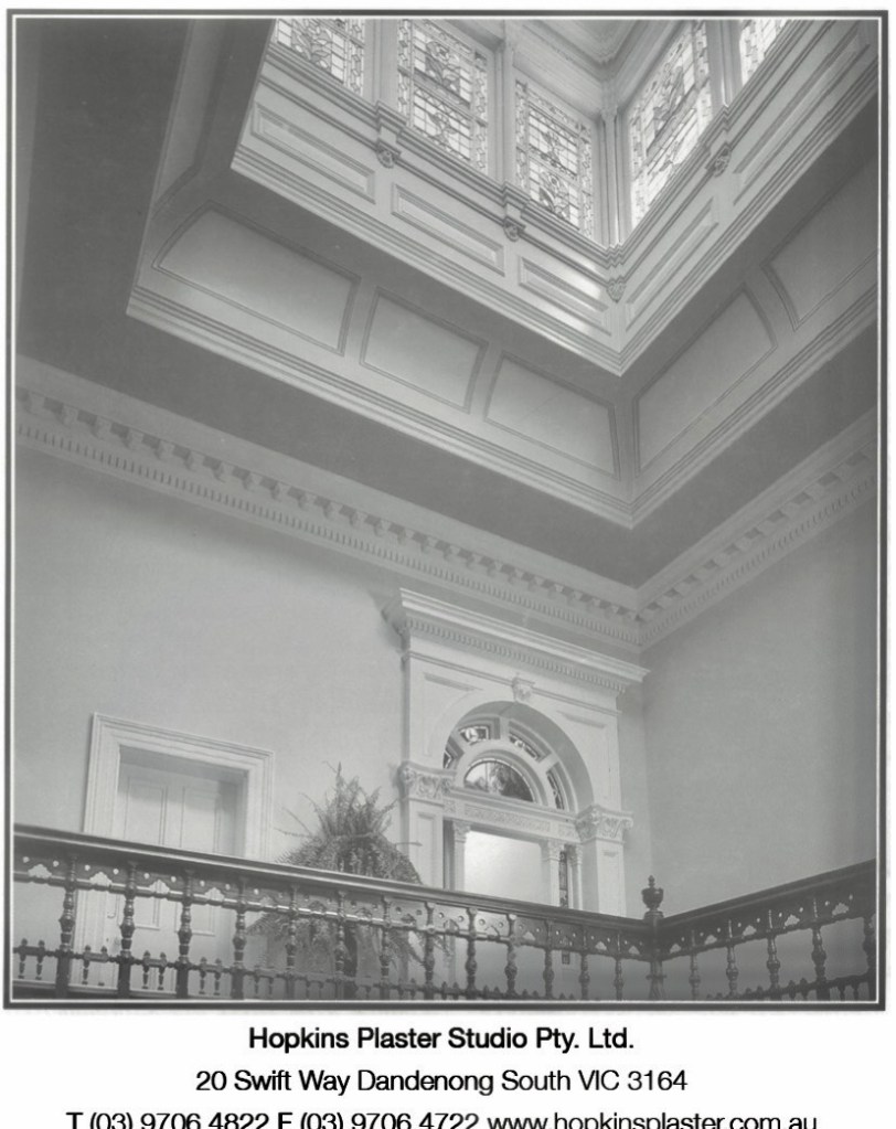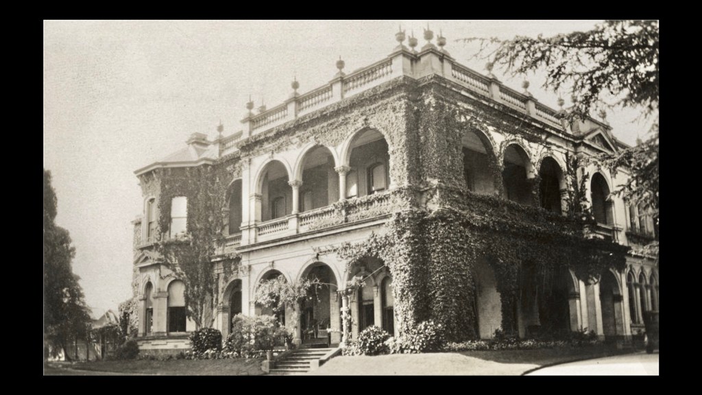 The house is in fact rather simple in style, much like many many other big late Victorian houses, with an L shaped double level arcaded verandah connecting projecting bays – but the important thing is that this is one of the first, built in 1867, when houses were usually far simpler. I can’t find a lot of confirmation of the date however, and the architect is unknown, but might have been Joseph Reed, who certainly was an innovator. I couldn’t find any pics earlier than c1900, and only one interior (from a Picton Hopkins catalogue), but apparently it has a carved timber staircase lit by a stained glass dome.