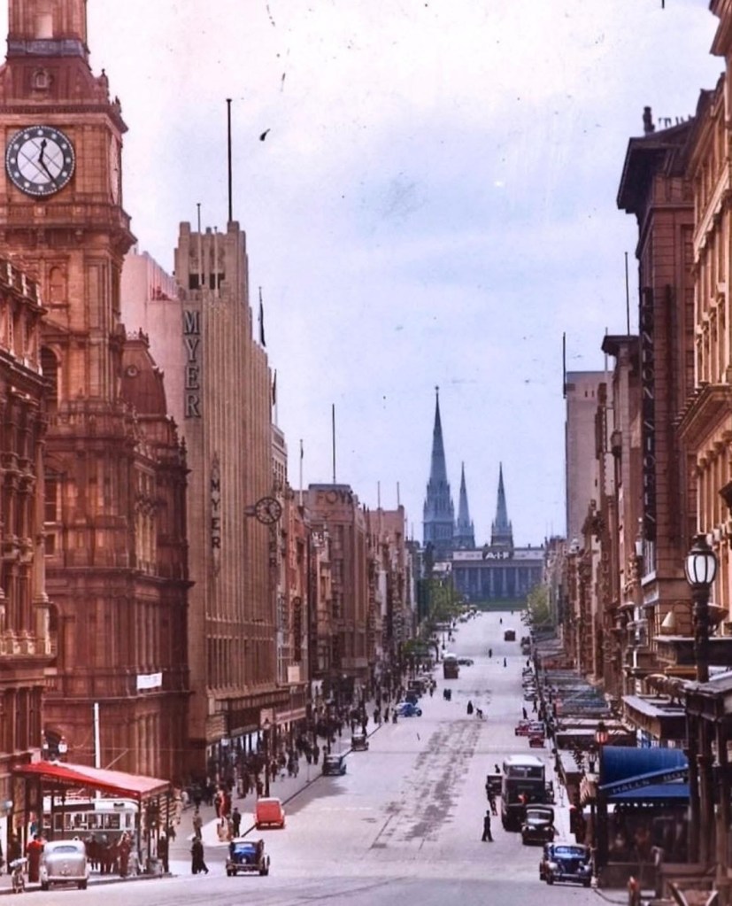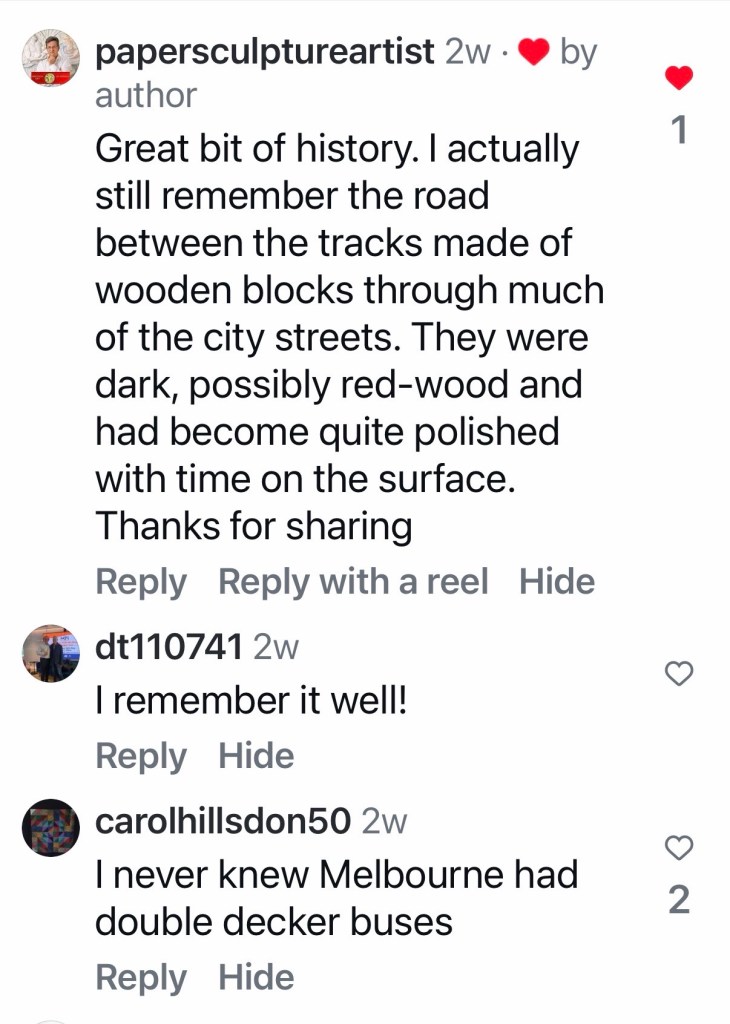 In the first image the rough surface must be the wood block pavers which were used to infill the road between the tracks. Eventually the buses proved unable to keep up with demand, and it was decided to reinstate trams here, starting up in 1955. This was largely because the head of the Melbourne & Metropolitan Tramways Board ex-Major General Robert Risson (since 1949) was a great believer in the efficiency of trams. He was in charge until 1970, and is widely regarded as the main reason we kept our trams, when almost all other major English speaking cities were ripping them out. Thanks Mr Risson ❤️ All pics via Facebook.