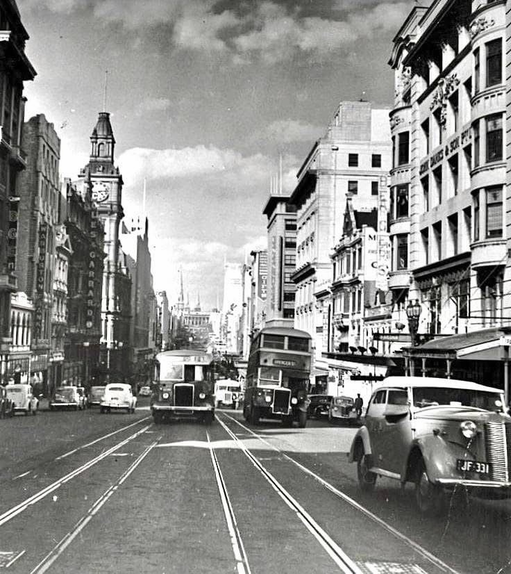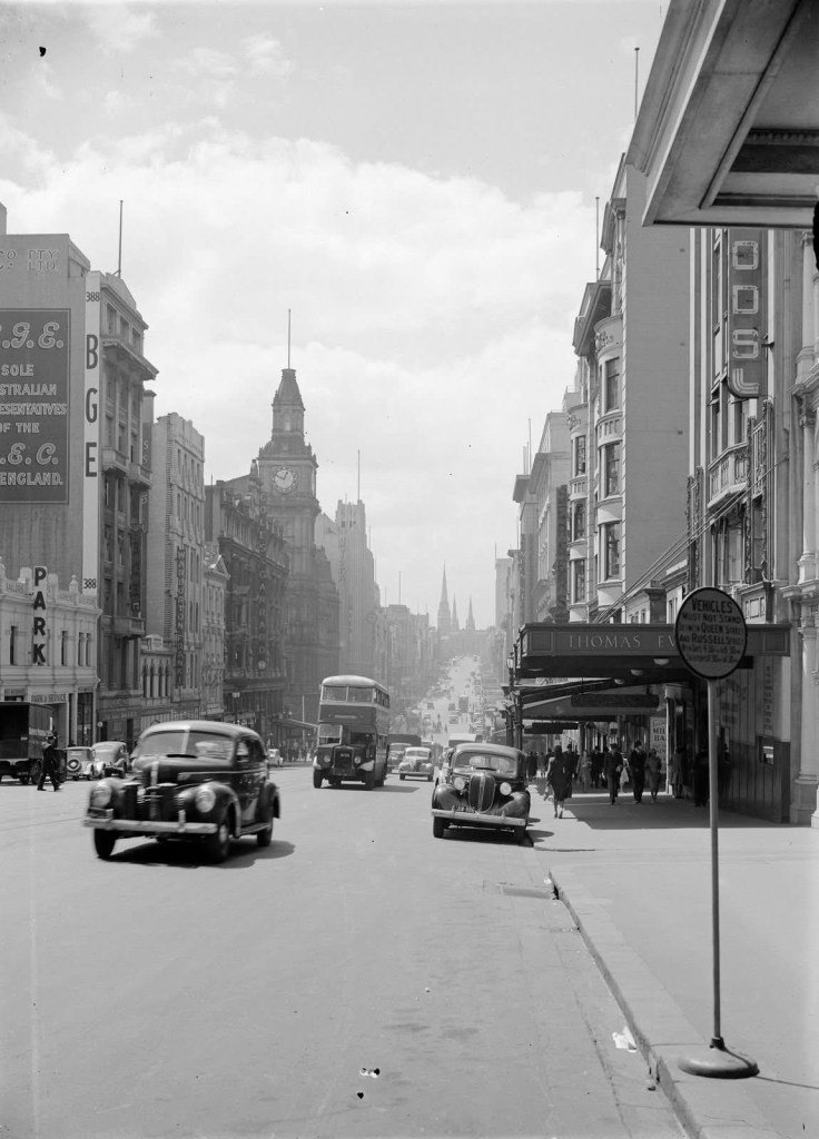 Various photos of Bourke Street from near Queen Street in the 1940s. I know they must be after 1940, because that’s when the last cable tram ran, replaced by double decker buses.