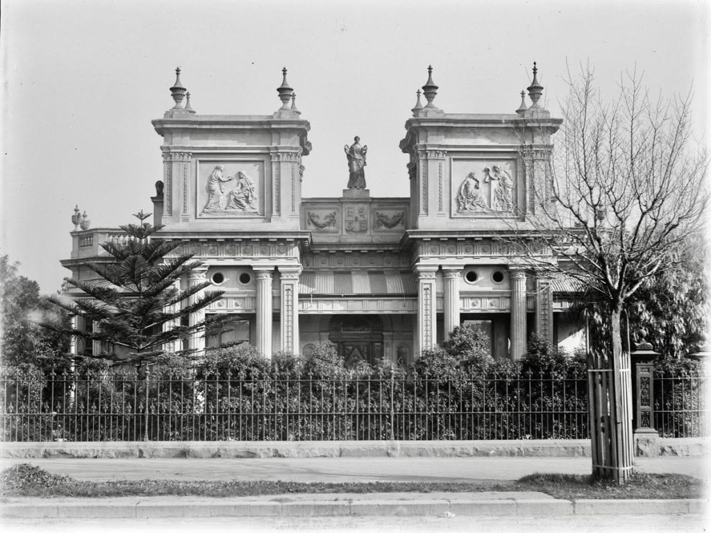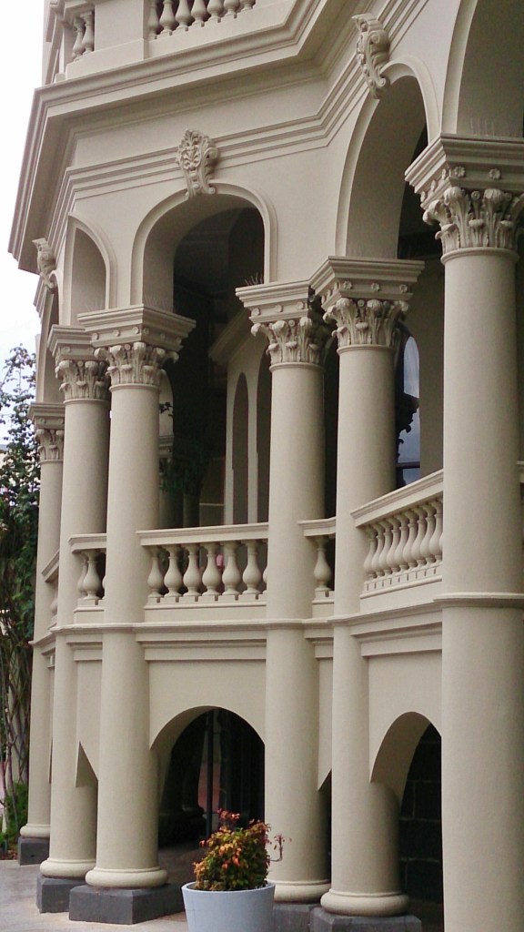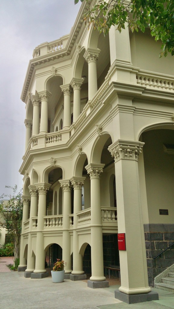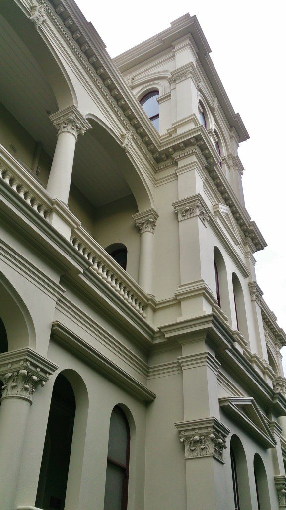 Built in peak boom 1889-91 like so many other mansions, it has the requisite tower and arcaded verandah. But what a verandah ! Wraps round three sides, double level plus a bit of basement, fat columns with corinthian capitals, and bowed on each side, where the arches above get squished into little pointy things. Goodness.