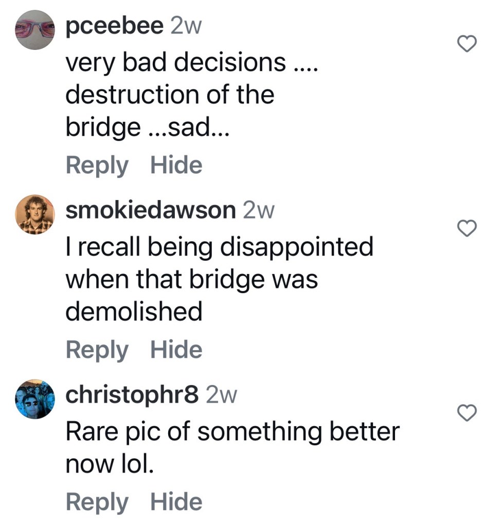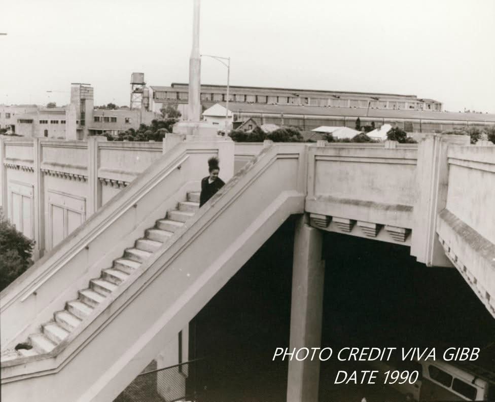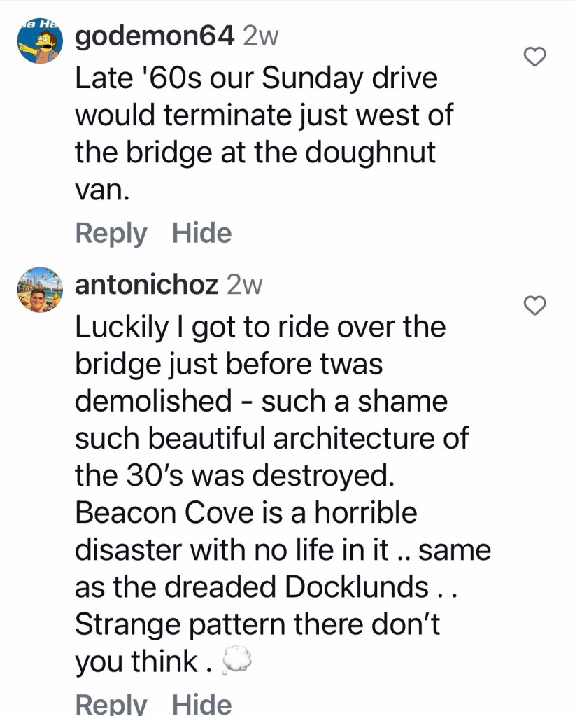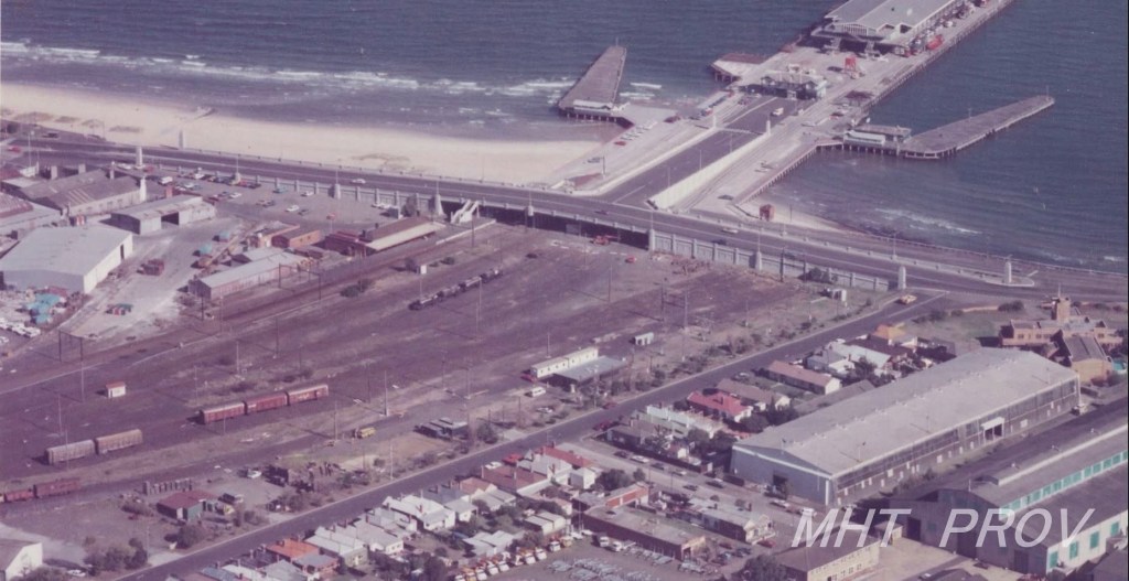 It was all concrete and pretty much like a wall for much of its very long ramps, but had some Art Deco style, especially the pylons and the nice lamps, which seems to be gone by the 60s. The MTH stands for the Melbourne Harbour Trust which built it. The area behind and to the west was largely railyards and storage, all redundant by the 1980s, so of course a comprehensive redevelopment was planned. The bridge was in the way so it was demolished in 1990, to allow for the rather flawed Beacon Cove townhouses and towers.