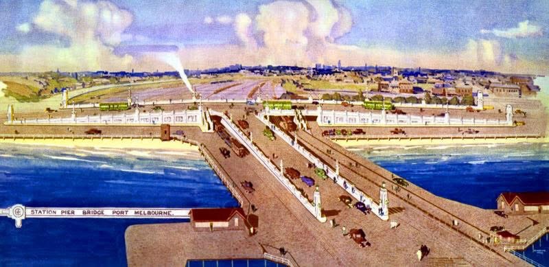 When the pier was rebuilt in the early 20s something like this was planned, but not built until 1934, prompted by the impending visit of the Duke of Gloucester (Prince Henry) for Victoria’s centenary celebrations in 1934-5. He arrived at Princes Pier (now just a stub) and was driven over the new bridge though it didn’t open to general traffic for another year.