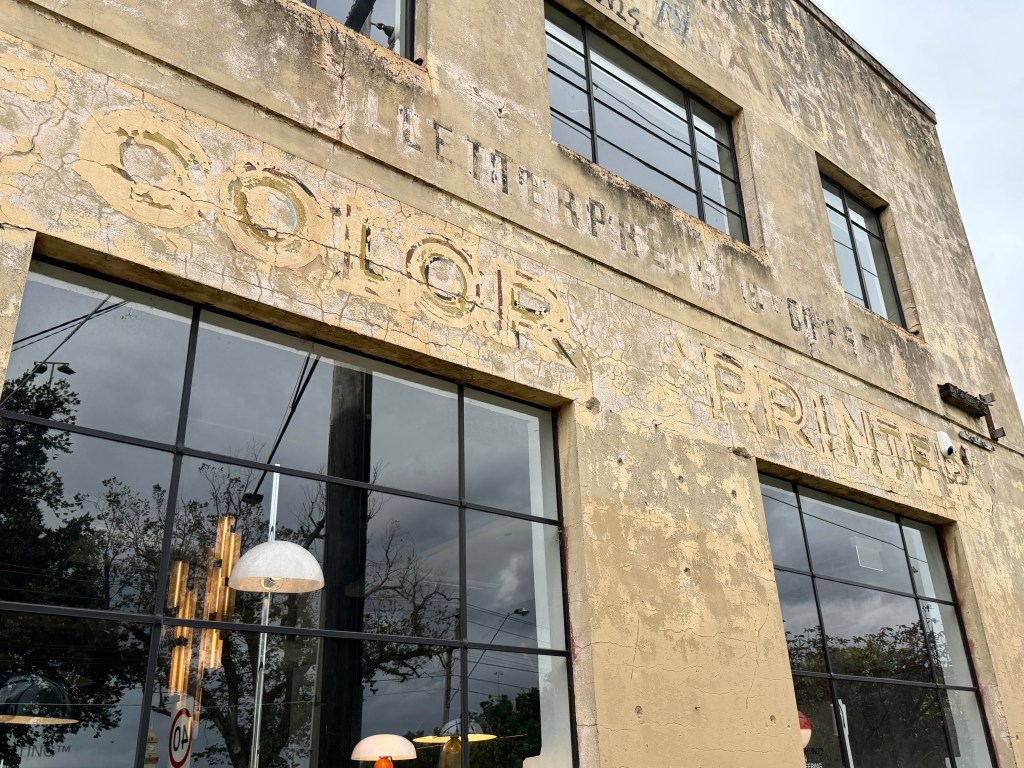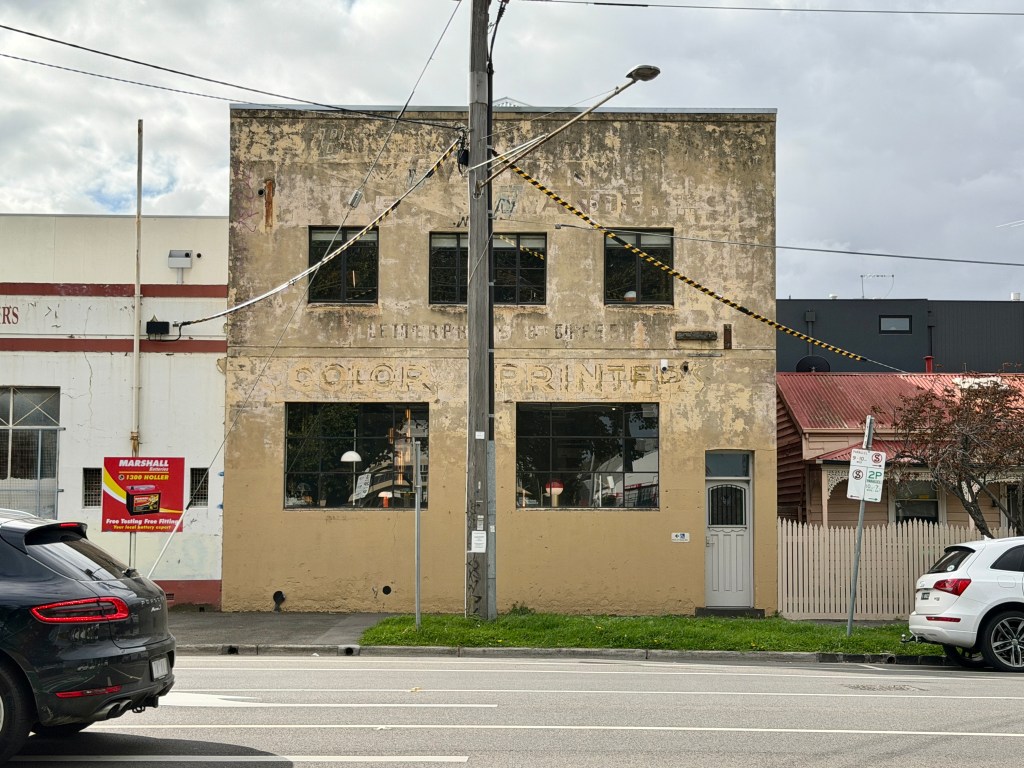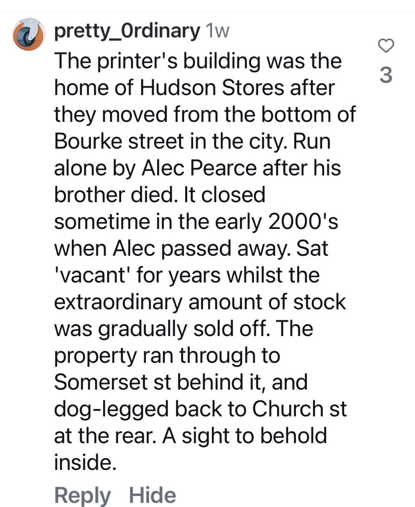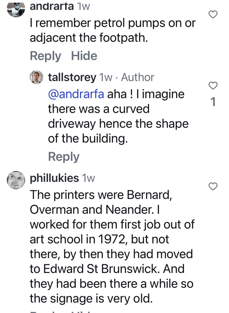 Next door is a similar period former printers, with lots of faded signs, I think they were more readable not that long ago, can’t read most of them now (a follower says it was Bernard Overman & Neander, and another pointed out it was the Hudson Stores from 1988 to c2000, packed with stuff that wasn’t cleaned out until 2009). The garage is listed as contributory in the heritage precinct, which is nice.